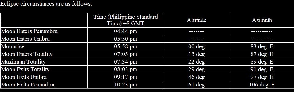 On the early evening of March 3, 2026, there will be a total lunar eclipse that will be visible in the Philippines as well as Asia, Australia , Pacific and most of the American continent. The Moon will enter the Earth’s light shadow (penumbra) at around 4:44pm (PST) and Earth’s dark shadow (umbra) at around 5:50pm (PST) when the moon is still below horizon. Moonrise will be around 5:58pm (PST) when a small part of the Moon is already eclipsed. The umbral phase will continue to progress until 07:05pm (PST) when it enters totality phase with the Moon situated 15 deg above the eastern horizon. Maximum totality phase will occur at around 7:34pm (PST) with the Moon 22 deg high. Totality phase ends at around 8:03pm (PST) with the Moon rising above 29 deg above the eastern horizon already. Afterwards, Moon will start to slowly exits the Earth’s dark shadow at around 9:17pm (PST). Moon will finally exits the umbral shadow at 10:23pm (PST) with the Moon 61 deg high above the eastern horizon ending the lunar eclipse. Belownis the local circumstances for the total lunar eclipse in Manila, Philippines.